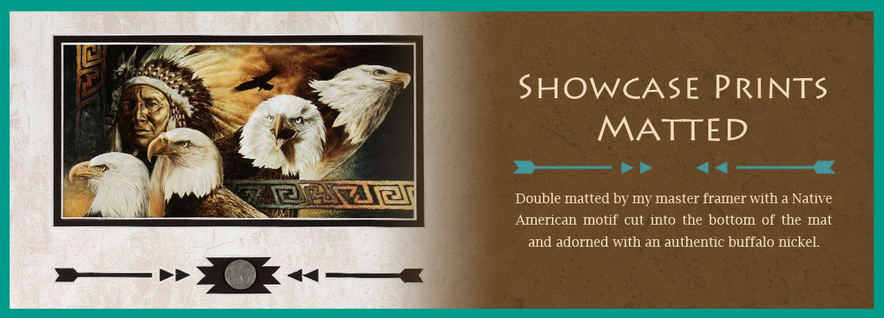 Each matted showcase print featuring the art of David Behrens is beautifully matted by our master framer. From the artistic detail of the Southwestern design cut into the bottom of the mat to the placement of an authentic buffalo nickel centered underneath the image, the finished result makes a lasting impression. This double matted showcase print measuring 11" X 14" includes an artist biography as well as a story about the painting written by David.